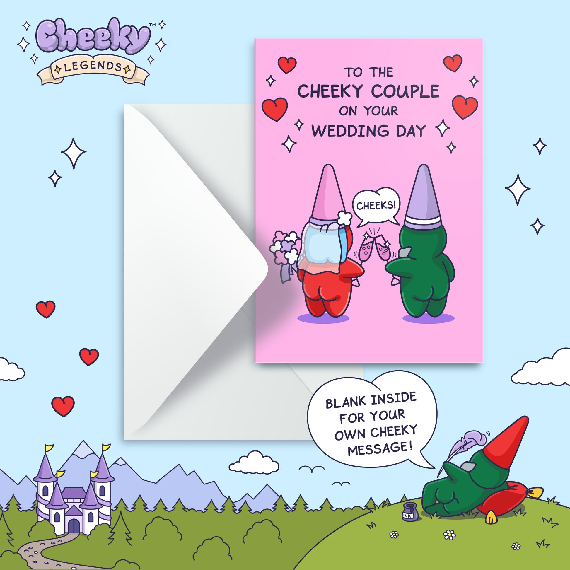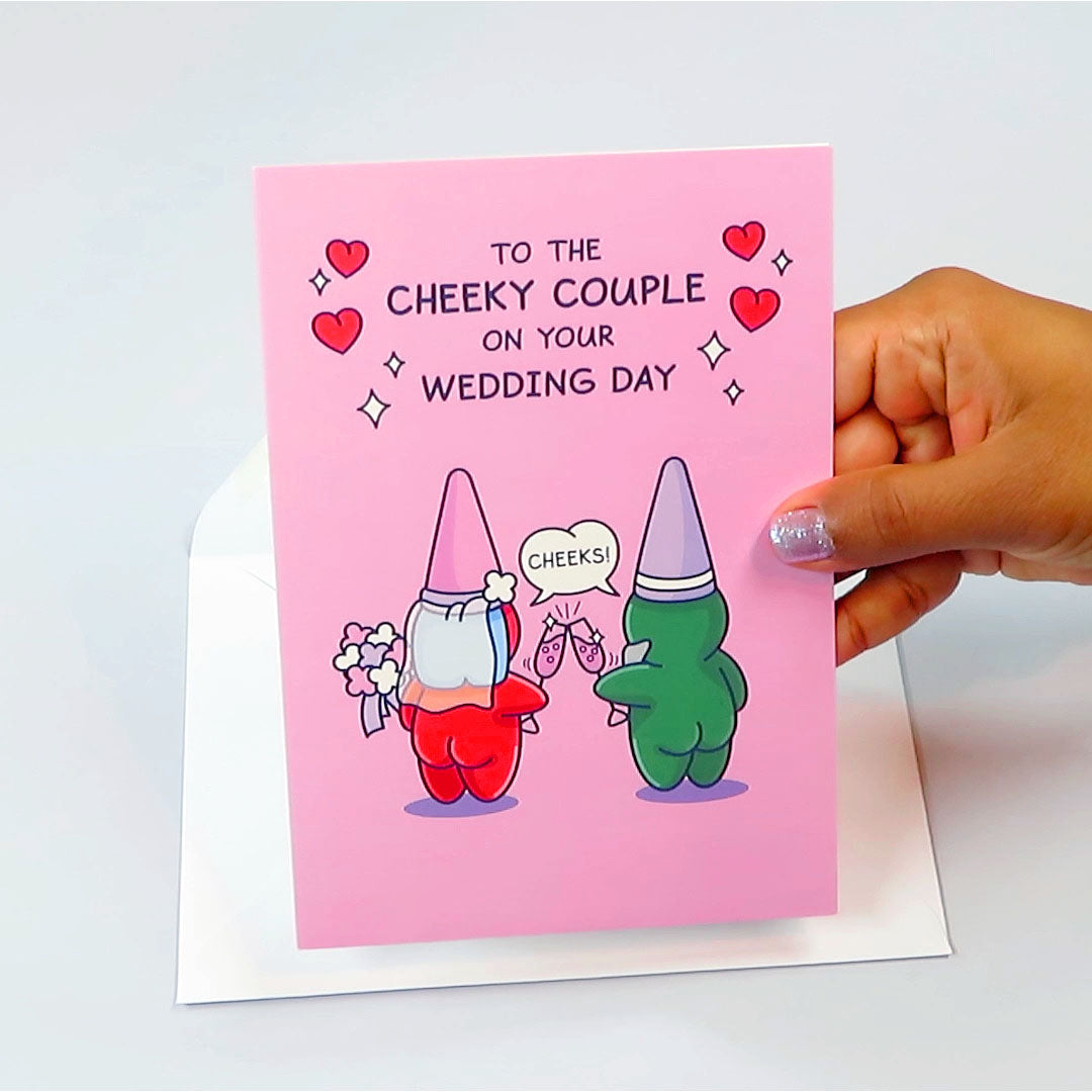 Rear Rear, to the love struck couple on their big day. Give them laughter as they crack open this gnome card. The perfect greeting 'Cheeky Legends' card to celebrate their marriage and a cheeky ever after together as Husband and Wife.