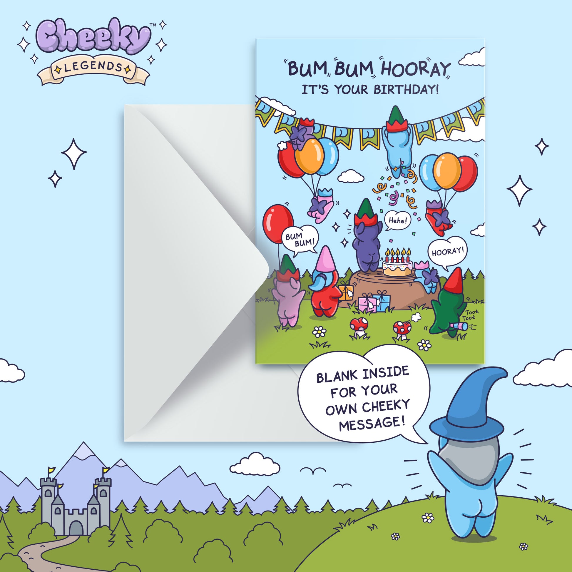 Bum Bum Hooray! It's time to celebrate your Birthday! A fun packed birthday card with plenty of cheekiness for the birthday boy or girl.