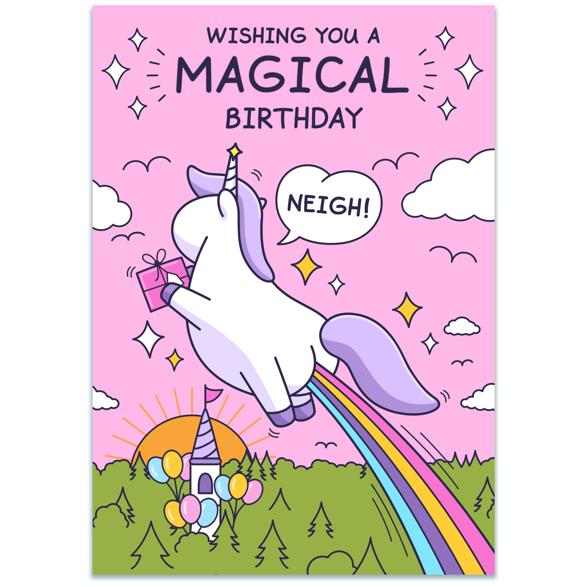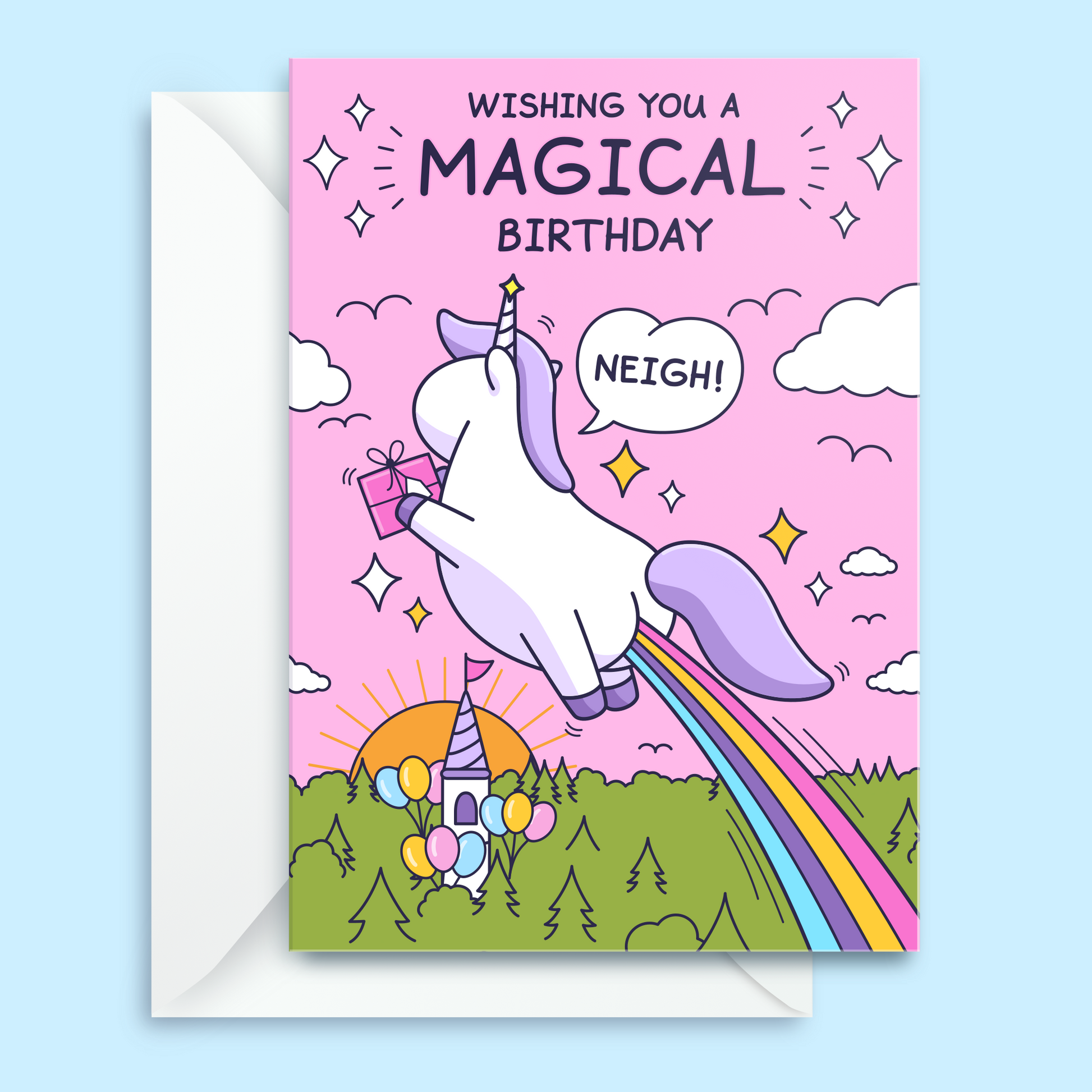 Celebrate a special girl's birthday with the magical Unicorn! Featuring pretty pink, sparkly stars and shooting rainbows! Neigh!