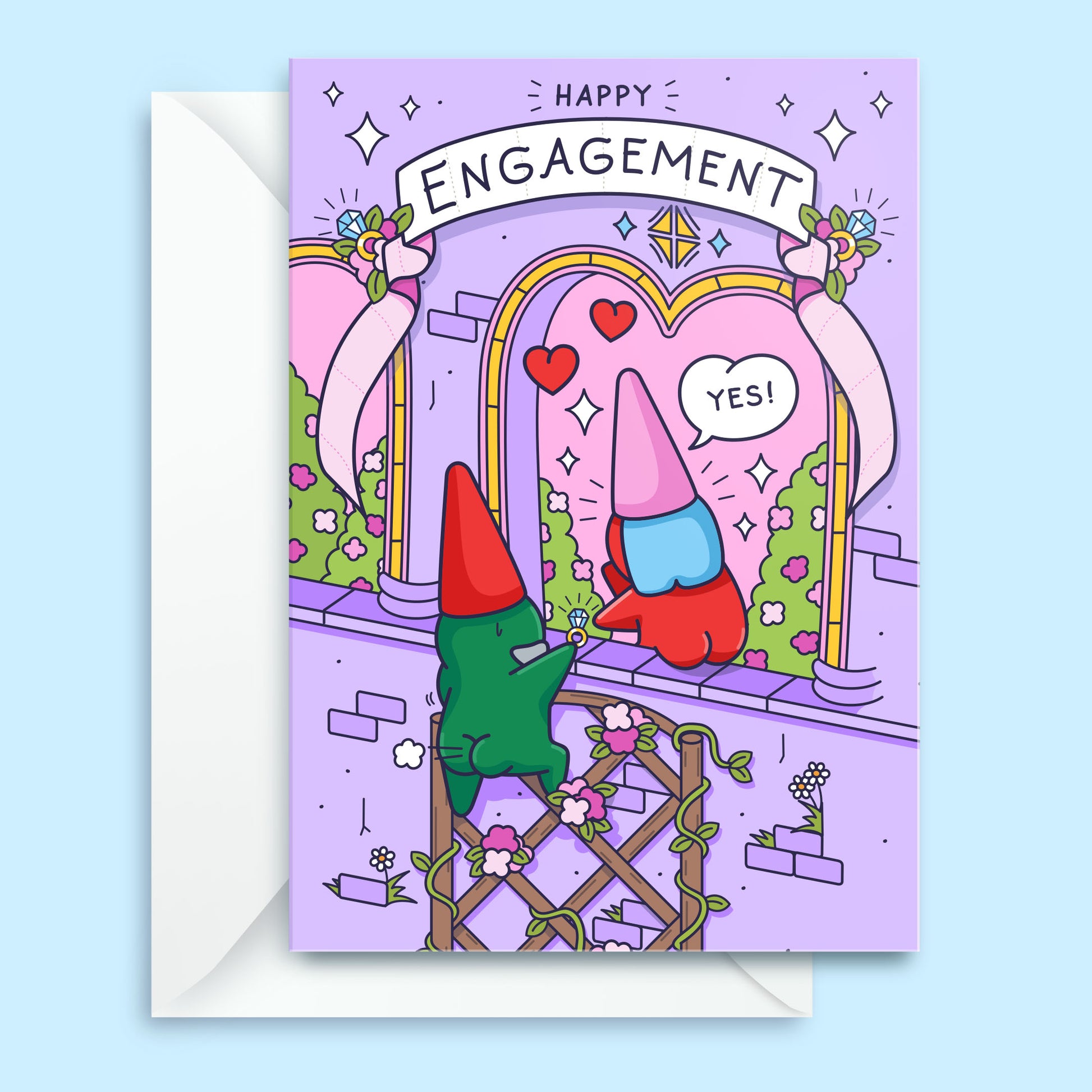 This beautiful engagement card captures the magical moment of a fairy tale proposal, a treasure they'll cherish forever! Featuring a cute gnome couple deeply in love, it's the perfect choice for a pair with a cheeky sense of humour and a taste for whimsical charm. 💌
